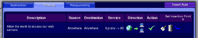 As you can see, we now have world accessible web servers, except for our intranet server which is accessible from nowhere. We therefore need some extra rules that are even more specific to allow each office access to the intranet server. These are inserted above the two existing rules, and each rule should match TCP connections from one of the office's networks to port 80 on the intranet server.